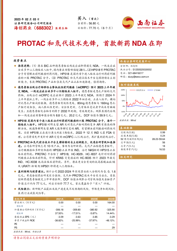 盈利预测与投资建议。预计公司2022-2024年实现营业收入分别约为0、0、1.6亿元。考虑海创药业研发实力强劲,氘代和PROTAC技术平台实力出众,首款创新药德恩鲁胺提交上市申请在即,DCF估值法测算公司管线估值及金融资产价值总计约为77亿元,对应目标价77.7元,首次覆盖给予“买入”评级。