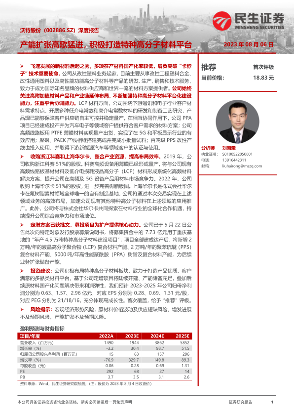 展望未来,随着定向增发项目的陆续开建和LCP、PPS、PPA等特种高分子材料产能的逐步释放,以及原材料国产化问题的有效解决,公司业绩有望实现爆发式增长。预计2023-2025年归母净利润将分别达到0.63亿元、1.57亿元和2.96亿元,展现出强劲的增长势头。尽管面临宏观经济波动、原材料价格和供应风险、增发及产能扩张不及预期等挑战,但公司凭借其清晰的战略、不断优化的产品结构和强大的研发实力,有望在国产替代的大背景下,持续提升其综合竞争力和市场地位。鉴于其高成长性和战略布局,首次覆盖给予“推荐”评级。