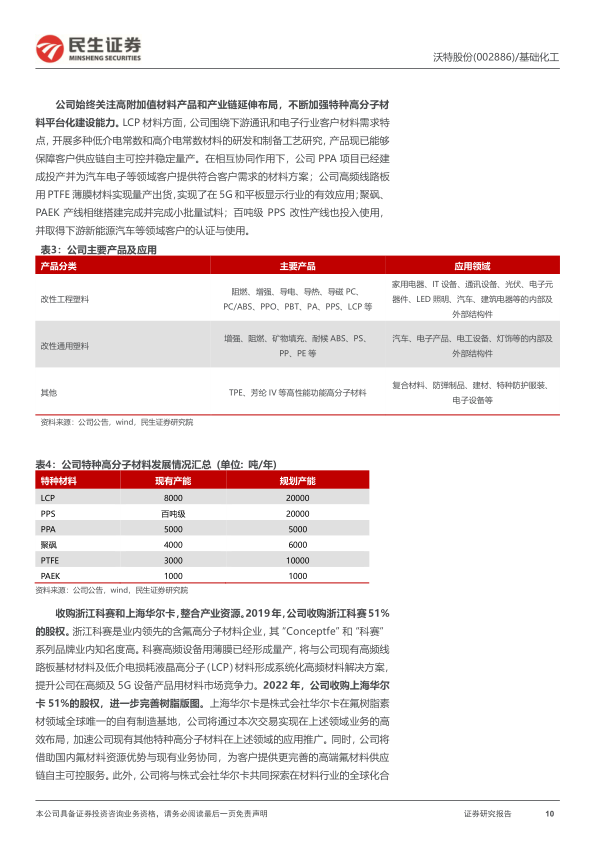 收购浙江科赛和上海华尔卡,整合产业资源,提高布局效率。2019年,公司收购浙江科赛51%的股权。科赛高频设备用薄膜已经形成量产,将与公司现有高频线路板基材材料及低介电损耗液晶高分子(LCP)材料形成系统化高频材料解决方案,提升公司在高频及5G设备产品用材料市场竞争力。2022年,公司收购上海华尔卡51%的股权,进一步完善树脂版图。上海华尔卡是株式会社华尔卡在氟树脂素材领域全球唯一的自有制造基地,公司将通过本次交易实现在上述领域业务的高效布局,加速公司现有其他特种高分子材料在上述领域的应用推广。此外,公司将与株式会社华尔卡共同探索在材料行业的全球化合作机遇,持续提升公司综合竞争力和市场地位。