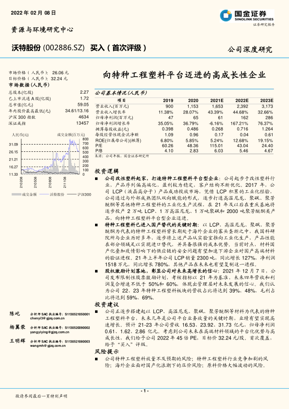 沃特股份正逐步搭建以LCP、高温尼龙、聚砜、聚芳醚酮等为代表的特种工程塑料平台,未来几年是平台业务放量的关键时期,业绩有望实现高速增长。考虑到公司在高端材料领域的平台化优势与高成长性,给予公司2022年45倍PE,目标价32.24元/股。首次覆盖,给予“买入”评级。