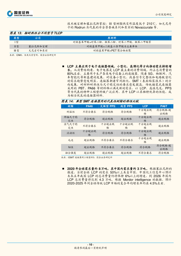 LCP作为一种具有取向有序的高分子材料,具备优异的机械性能、低吸湿性、耐化学腐蚀性、耐热性、阻燃性以及低介电常数和介电损耗因数,广泛应用于电子电器、航空航天、光通讯等高新技术领域。其主要应用于电子连接器领域,随着5G、物联网、汽车智能化发展,对材料耐热性和尺寸稳定性要求提高,LCP成为优选材料。2020年全球LCP需求量约8万吨,中国需求约3万吨,预计到2026年国内需求将达4.3万吨。LCP生产壁垒高,目前产能集中于美国和日本,但中国产能快速增长,沃特股份、金发科技、普利特等企业已陆续投产,国内总产能约2.1万吨,CR3达85%。疫情对海外供应链的扰动加速了国产替代进程,国内LCP销量呈现放量趋势。