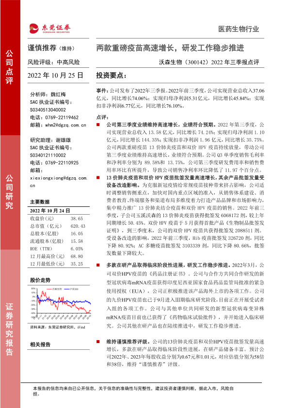 2022年三季报点评,两款重磅疫苗高速增长,研发工作稳步推进