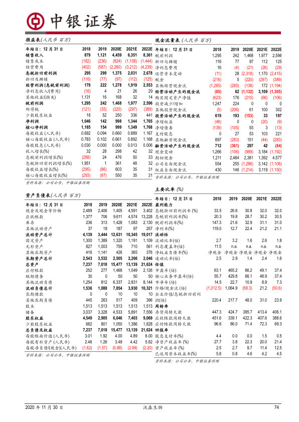 由于嘉和生物上市带来公允价值变动收益,我们上调 2020 年 EPS 预测至 0.66(此前 0.59),维持 2021-2022 年 EPS0.89、1.17 不变,对应净利润为 9.98 亿、13.44 亿、17.65 亿。全年业绩有望继续超预期,维持增持评级。