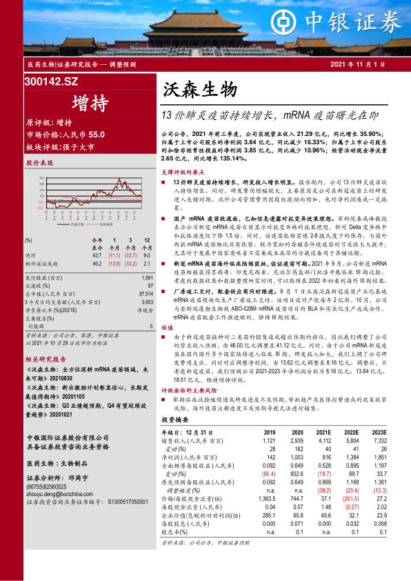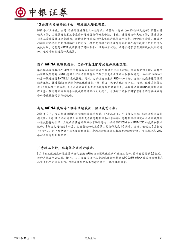 沃森生物在2021年前三季度展现出强劲的营业收入增长和经营现金流表现,但受新冠mRNA疫苗研发投入加大、股权激励费用增加以及新冠疫苗接种对其他二类苗销售的短期冲击影响,净利润出现阶段性下滑。公司在mRNA疫苗领域的战略布局进展顺利,其新冠mRNA疫苗在对抗变异株和储存条件方面具备显著优势,海外III期临床试验和产业化基地建设均按计划推进,预计2022年初将有海外临床结果。尽管短期业绩预测因市场环境和研发投入而调整,但公司凭借13价肺炎疫苗的稳健增长和mRNA疫苗的巨大潜力,长期发展前景依然广阔。因此,中银证券维持其“增持”评级,并提示投资者关注临床试验进度、政策变化及海外注册销售等潜在风险。