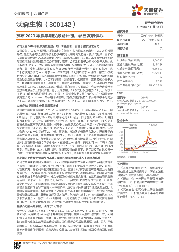 预计公司2020-2022年EPS分别为0.65、1.00及1.35元,对应PE分别为77、50及37倍。公司布局mRNA技术开发新冠疫苗等,随着13价肺炎疫苗的上市,公司业绩有望迎来强劲增长,同时公司研发的加速推进为长期发展奠定基础,考虑到行业的高景气度加上公司后续的成长性,我们看好公司后续的发展,维持“买入”评级风险提示:新冠疫苗研发不确定性,其他产品研发进度、结果低于预期;13价疫苗等产品销售低于预期;政策风险;疫苗公共安全事件风险;新冠疫情负面影响超预期