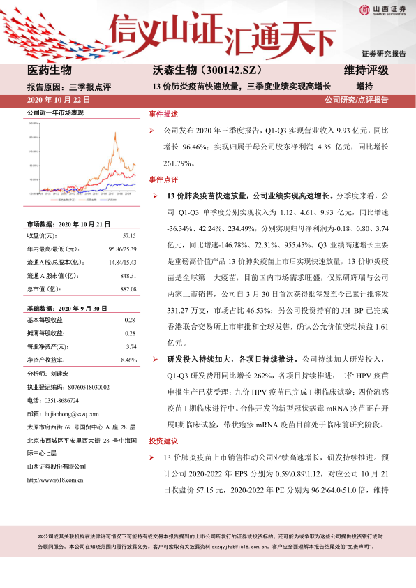 基于13价肺炎疫苗的销售推动及研发项目的持续进展,分析师预计公司2020-2022年EPS分别为0.59元、0.89元和1.12元。对应2020年10月21日收盘价57.15元,2020-2022年PE分别为96.2倍、64.0倍和51.0倍。维持“增持”的投资评级。