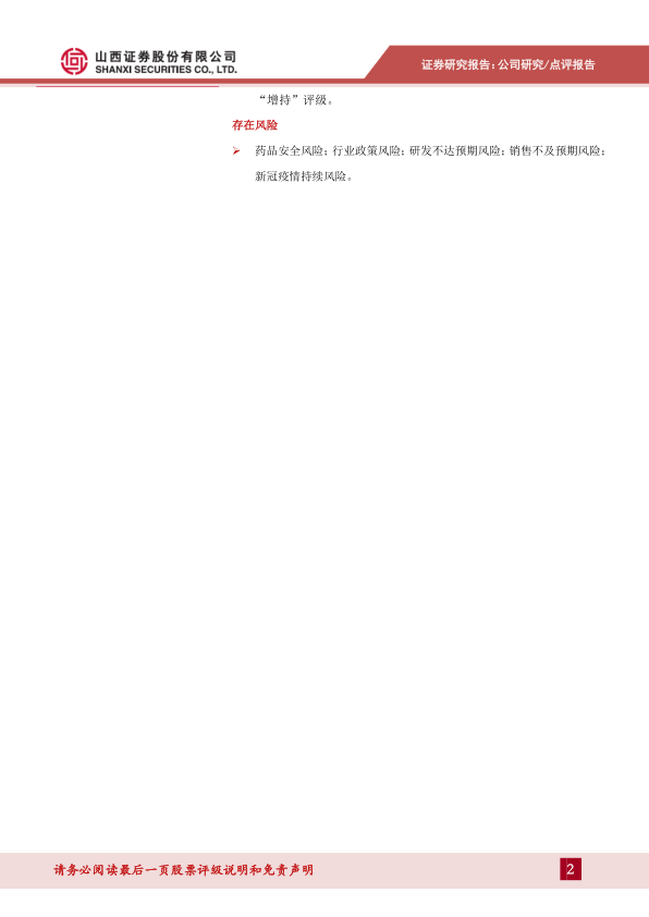 公司面临药品安全风险、行业政策风险、研发不达预期风险、销售不及预期风险以及新冠疫情持续风险。