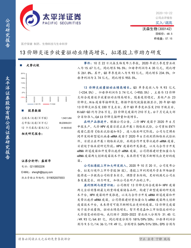13价肺炎结合疫苗逐步放量驱动业绩高增长。Q3单季度收入为9.93亿元(+234.5%),归母净利润为3.74亿元(+955.5%)。20年Q1-Q3 13价肺炎批签发330万支左右,其中Q3单季度批签发210万瓶左右。
