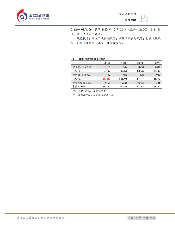 预计2020-2022年营业收入分别为31.45亿/49.93亿/64.81亿,同比增速分别为181%/59%/30%;归母净利润分别为9.5亿/14.36亿/19.49亿,分别增长569%/51%/35%;EPS分别为0.62/0.93/1.26,给予“买入”评级。