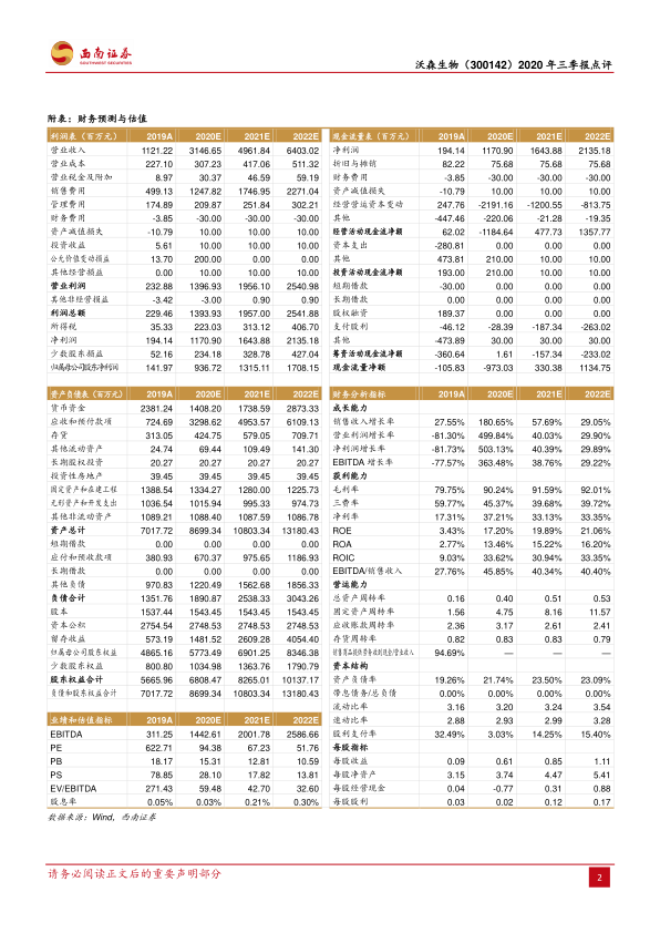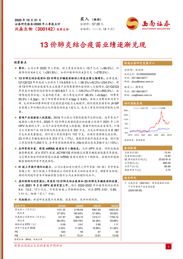 本报告对沃森生物2020年三季报进行了深入分析,指出公司业绩增长主要受益于13价肺炎结合疫苗和23价肺炎多糖疫苗的销售放量。公司盈利能力显著提升,在研管线丰富,并积极推进国际化战略。维持对公司“买入”评级,并提示了新冠研发进展不及预期、政策风险、竞争加剧风险等风险因素。