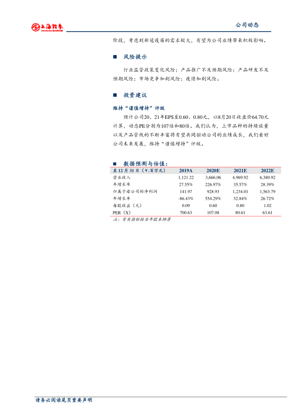 沃森生物作为疫苗生产企业,其13价肺炎疫苗的快速放量以及在研管线的有序推进,将共同驱动公司业绩增长。报告维持对沃森生物“谨慎增持”评级,看好公司未来发展。