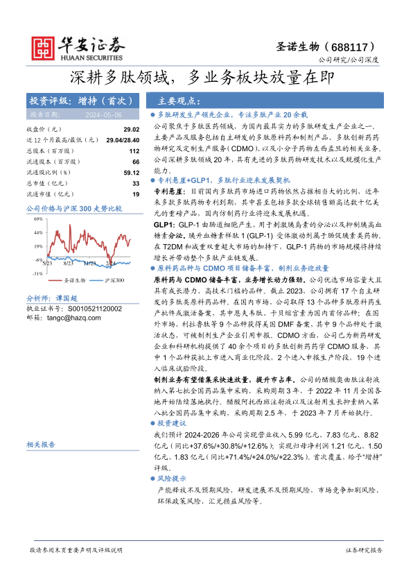 在可比公司估值方面,我们选取了3家同属于Wind行业分类中II级行业制药、生物科技与生命科学板块的公司进行对比:奥锐特(主要从事特色复杂原料药和医药中间体的研发、生产和销售)、诺泰生物(业务结构与圣诺生物相似,聚焦多肽药物及小分子化药的自主研发与定制研发生产)、九洲药业(国内领先的CDMO企业,涵盖小分子化学药物、多肽药物等)。截至2024年4月30日收盘,圣诺生物的P/E估值在可比公司中处于合理区间。