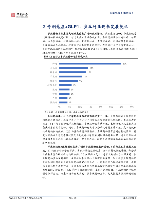 多肽药物在临床各大领域展现出广泛的应用潜力。多肽是由2~99个氨基酸通过肽键连接而成的短链,可为天然来源或合成来源。多肽类药物在治疗肿瘤、糖尿病、心血管疾病、肢端体肥大症、骨质疏松症、胃肠道疾病、中枢神经系统疾病、免疫疾病以及抗病毒、抗菌等方面具有显著疗效。目前全球获批的多肽药物中,抗肿瘤领域数量最多,占比达30%;其次是消化道领域(14%)、糖尿病领域(13%)和罕见病(11%)。
