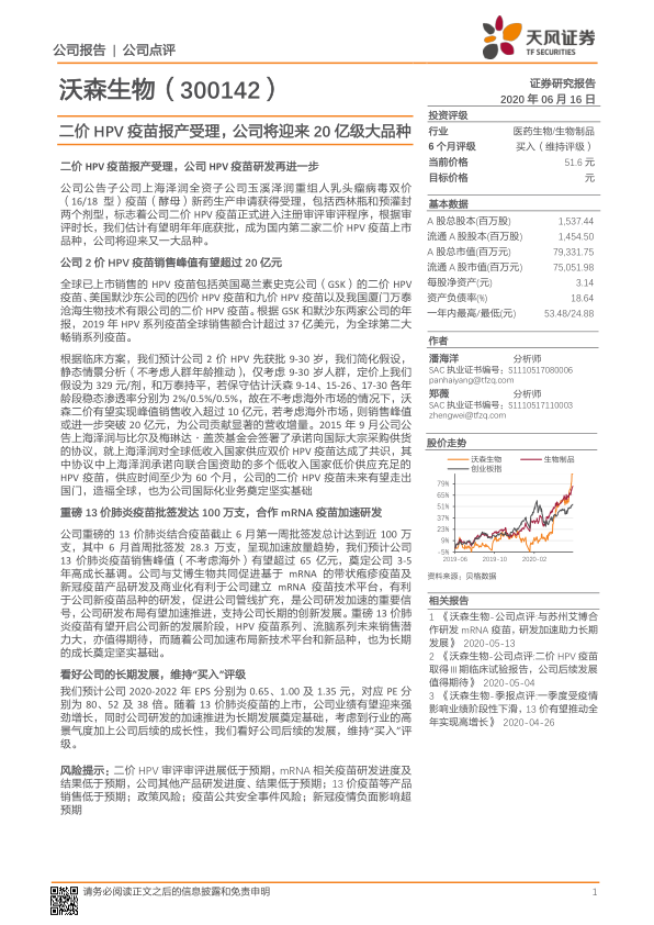 本报告对沃森生物的二价HPV疫苗和13价肺炎疫苗的最新进展进行了分析,并对公司未来的发展前景持乐观态度。二价HPV疫苗报产受理,有望成为公司新的增长点;13价肺炎疫苗加速放量,将奠定公司未来几年的高成长基调。同时,公司积极布局mRNA疫苗技术平台,有望加速研发布局,为长期发展奠定坚实基础。维持“买入”评级。