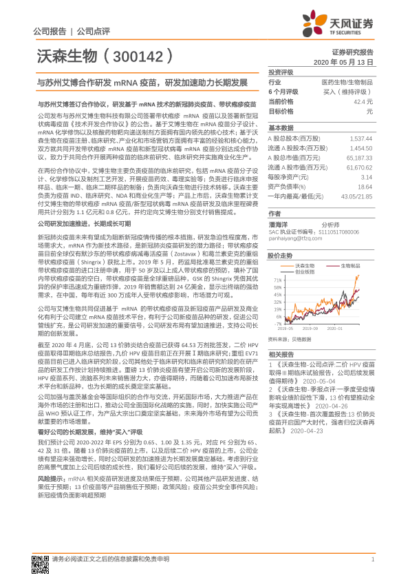 本报告分析了沃森生物与苏州艾博合作研发 mRNA 疫苗的战略意义,认为此举将加速公司研发进程,并为长期发展奠定基础。同时,报告强调了新冠肺炎疫苗和带状疱疹疫苗的市场潜力,以及公司现有疫苗产品的研发进展和国际市场拓展。基于对公司未来盈利能力的预测和行业前景的判断,维持对沃森生物的“买入”评级。
