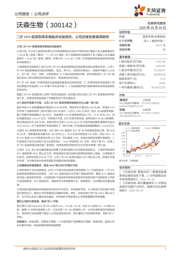天风证券对沃森生物的长期发展持乐观态度,维持“买入”评级。预计公司2020-2022年EPS分别为0.65元、1.00元及1.35元,对应PE分别为62倍、41倍及30倍。财务数据显示,公司营业收入预计在2020年实现216.66%的爆发式增长,达到35.50亿元,并在2021年和2022年分别增长38.67%和32.76%。净利润预计在2020年实现601.33%的显著增长,达到9.96亿元,并在2021年和2022年继续保持54.24%和35.37%的增长。毛利率和净利率也呈现稳步提升趋势,预计2022年毛利率将达到90.56%,净利率达到31.81%,显示出公司强大的盈利能力和成长潜力。