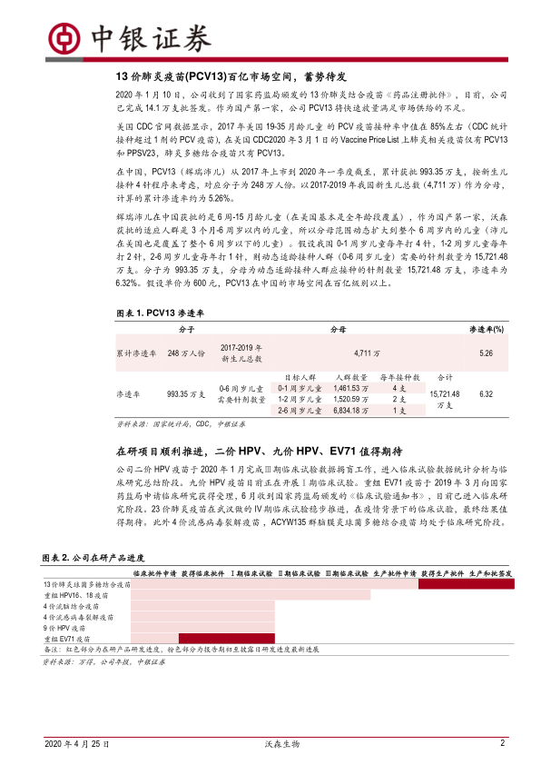 本报告的核心观点在于,尽管沃森生物2020年第一季度受新冠疫情影响出现暂时性亏损,但其业绩有望在第二季度迅速恢复。公司自主研发的13价肺炎结合疫苗(PCV13)已获批上市并开始批签发,凭借其百亿级的市场空间和国产首家的优势,预计将成为公司未来业绩增长的核心驱动力。同时,公司在二价HPV、九价HPV、EV71等多个重磅疫苗项目上的顺利推进,以及《疫苗管理法》实施带来的行业集中度提升,都将进一步巩固公司的市场地位和长期增长潜力。