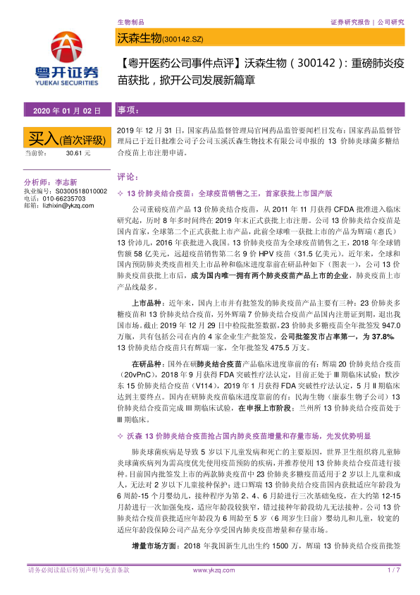 【粤开医药公司事件点评】沃森生物:重磅肺炎疫苗获批,掀开公司发展新篇章