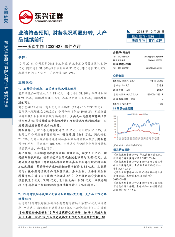 沃森生物2018年第三季度业绩表现强劲,营业收入和归母净利润均实现大幅增长,显著超出市场预期,公司财务状况明显好转。这主要得益于疫苗销售额的增加以及财务费用的有效控制。同时,公司核心产品13价肺炎结合疫苗的上市进程顺利推进,已进入优先审评后的补充资料阶段,预计将于2019年初获批上市。