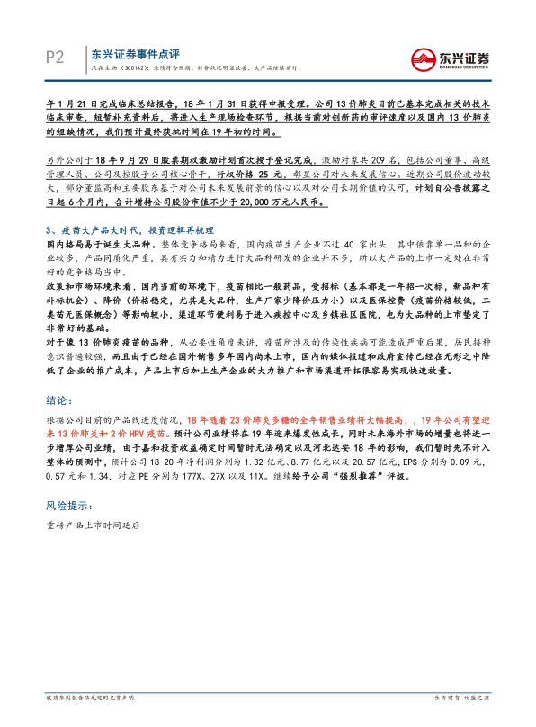 公司的13价肺炎球菌多糖结合疫苗作为第27批优先审评名单中的拟纳入品种,于9月底收到补充资料通知。该疫苗自2015年4月获得临床批件,2016年4月进入临床III期,2017年12月完成揭盲,2018年1月完成临床总结报告并获得申报受理。目前已基本完成技术临床审查,预计在短暂补充资料后将进入生产现场检查环节,有望于2019年初获批上市。此外,公司于2018年9月29日完成股票期权激励计划首次授予登记,激励对象包括核心骨干,行权价格为25元。同时,部分董监高和主要股东计划在6个月内合计增持公司股份市值不少于2亿元人民币,充分体现了对公司未来发展前景的坚定信心。