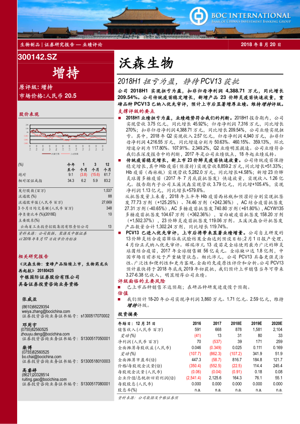 本报告的核心观点是沃森生物2018年上半年业绩扭亏为盈,主要得益于传统疫苗的稳定增长和新上市的23价肺炎疫苗的快速放量。更重要的是,公司重磅品种PCV13已纳入优先审评,预计获批上市后将显著增厚公司业绩,为公司带来可观的收入增长。