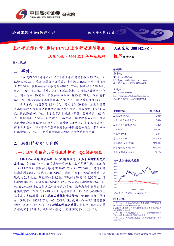 半年报跟踪:上半年业绩扭亏,静待PCV13上市带动业绩爆发