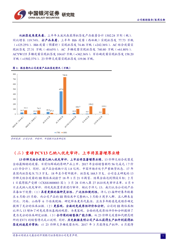 沃森生物2018年上半年业绩实现显著扭亏为盈,主要得益于现有疫苗产品的稳定增长和新产品的快速放量。公司未来业绩增长的核心驱动力在于重磅产品13价肺炎结合疫苗(PCV13)的上市,该产品已进入优先审评,有望在短期内获批,并结合股权激励计划,彰显公司对未来业绩爆发的强烈信心。