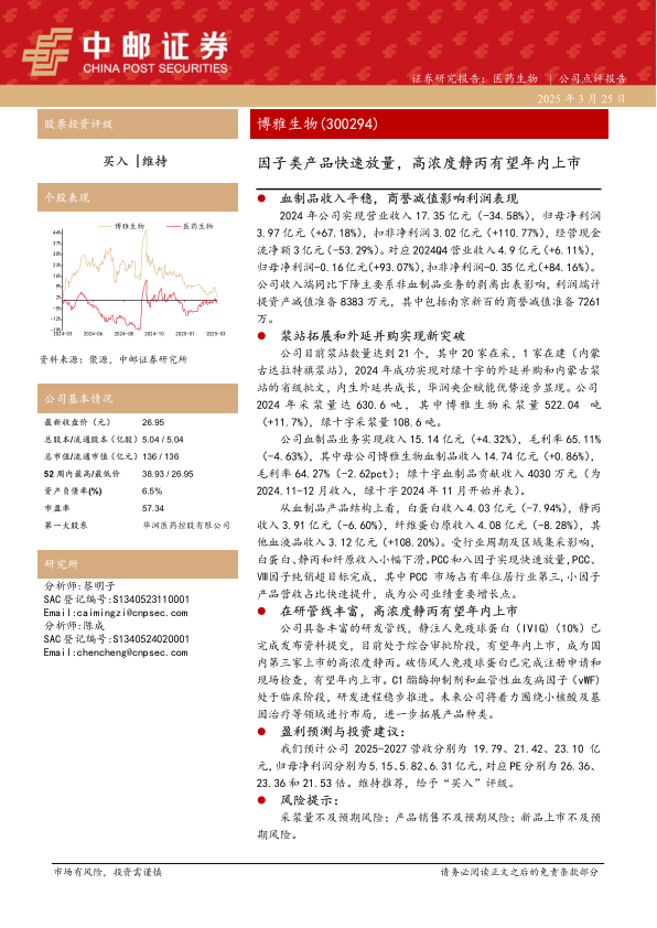 本报告分析了博雅生物(300294)2024年的经营业绩,指出公司血制品业务收入保持平稳增长,同时因子类产品实现快速放量,成为业绩增长的重要驱动力。此外,高浓度静丙有望年内上市,将进一步丰富公司的产品线。