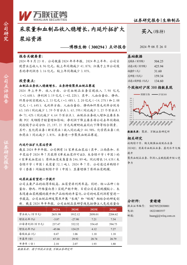 博雅生物2024年上半年在血制品业务上展现出稳健增长态势,该板块收入同比增长3.60%。尽管整体营收和净利润受非血制品业务剥离及去年同期高基数影响有所下降,但公司通过内延外拓积极扩大浆站资源,采浆量同比增长14.63%,并成功并购绿十字(中国)以进一步提升原料血浆规模。公司血浆利用效率高,核心产品产销平衡,未来吨浆收益有望随规模扩大和产品结构优化而提升。万联证券维持对公司2024-2026年的盈利预测和“买入”评级,认为公司在血制品领域的聚焦和扩张将为其带来长期增长潜力。