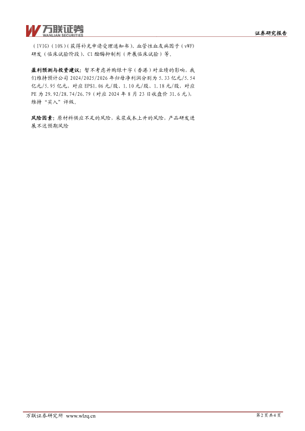 风险因素:原材料供应不足的风险,采浆成本上升的风险,产品研发进展不达预期风险