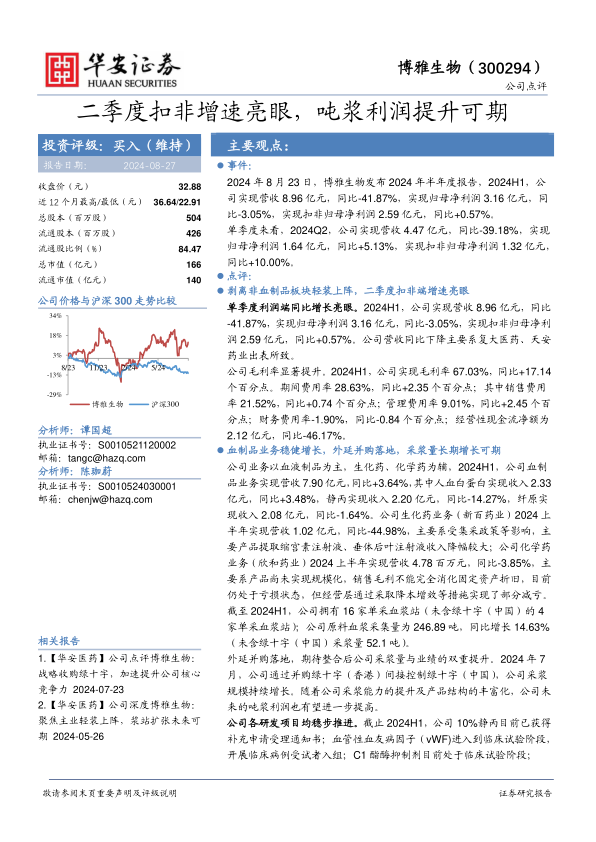 博雅生物2024年半年度报告显示,公司通过剥离非血制品业务,实现了轻装上阵,二季度扣非净利润增速显著。公司未来将更加专注于血制品业务,并通过外延并购等方式,提升采浆量和吨浆利润,实现长期增长。