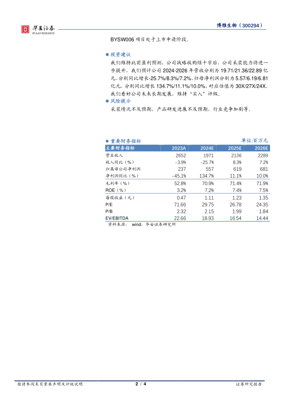 华安证券维持对博雅生物“买入”评级,主要基于公司战略收购绿十字后,采浆能力将进一步提升的预期。预计公司未来营收和净利润将保持稳定增长,对应估值具有吸引力。
