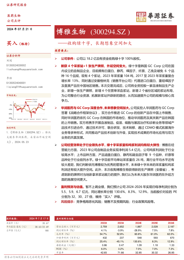 本次博雅生物收购绿十字,不仅直接增加了浆站数量和生产牌照,更重要的是,通过与华润医药和GC Corp的合作,为公司未来的发展打开了新的增长空间。博雅生物在经营效率方面的优势,将有助于提升绿十字的采浆量和盈利能力。维持“买入”评级,但需注意竞争格局、销售和政策等风险。