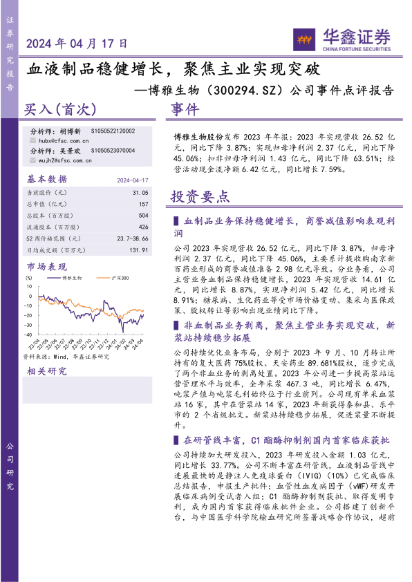 公司2023年实现营收26.52亿元,同比下降3.87%,归母净利润2.37亿元,同比下降45.06%,主要系计提收购南京新百药业形成的商誉减值准备2.98亿元导致。分业务看,公司主营业务血制品保持稳健增长,2023年实现营收14.61亿元,同比增长8.87%,实现净利润5.42亿元,同比增长8.91%;糖尿病、生化药业等受市场价格变动、集采与医保政策、股权转让等影响出现业绩同比下降。