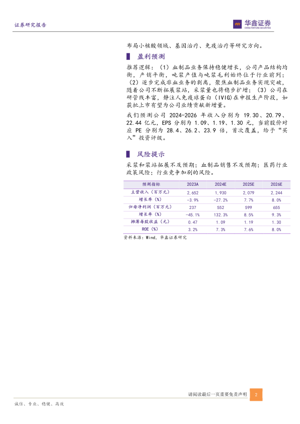 采浆和浆站拓展不及预期;血制品销售不及预期;医药行业政策风险;行业竞争加剧的风险。