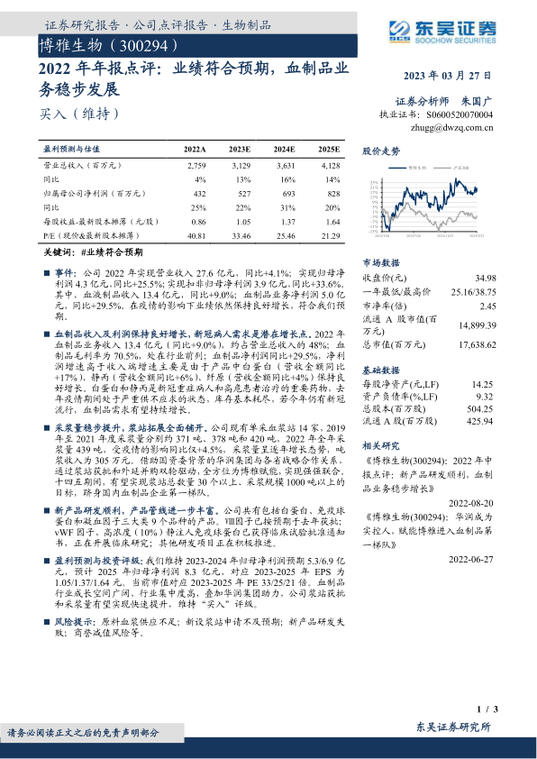 事件:公司2022年实现营业收入27.6亿元,同比+4.1%;实现归母净利润4.3亿元,同比+25.5%;实现扣非归母净利润3.9亿元,同比+33.6%。其中,血液制品收入13.4亿元,同比+9.0%;血制品业务净利润5.0亿元,同比+29.5%。在疫情的影响下业绩依然保持良好增长,符合我们预期。