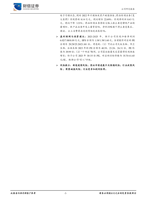 盈利预测与投资建议 : 2023-2025 年,预计公司实现归母净利润6.02/7.00/8.09 亿元, EPS 分别为 1.19/1.39/1.60 元,当前股价对应的 PE分别为 29.29/25.20/21.80 倍。考虑到:( 1)可比公司天坛生物、华兰生物、派林生物 2023 年的 PE 分别为 40.39、 23.28、 26.31 倍, PE 均值为 29.99 倍;( 2) “十四五”期间,公司浆站数量及采浆量将实现快速增长;给予公司 2023 年 30-35 倍 PE,对应的目标价格为 35.70-41.65元/股, 维持公司“买入”评级。