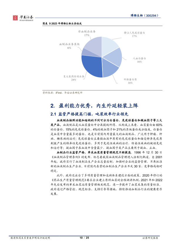 博雅生物是华润大健康板块的血液制品平台,是全国少数人血白蛋白、人免疫球蛋白、凝血因子三大类产品齐全的企业之一。公司坚持以血液制品为主导的原则,持续推进血液制品业务健康、快速发展。在做优主业方面,不断优化业务布局,逐步完成了复大医药和天安药业等非血业务的剥离处置,解决了与控股股东同业竞争事项。2023年公司实现营收26.52亿元,同比减少3.88%,归母净利润2.37亿元,同比减少45.06%,业绩下滑主要是受计提资产减值准备的影响。