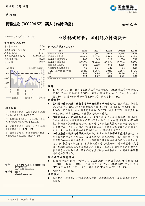国金证券维持对博雅生物的盈利预期,预计公司2022年至2024年分别实现归母净利润5.1亿元(同比增长48%)、6.06亿元(同比增长19%)和7.00亿元(同比增长15%)。对应的摊薄每股收益(EPS)分别为1.0元、1.2元和1.4元,对应当前市盈率(PE)分别为32倍、27倍和23倍。基于此,国金证券维持对博雅生物的“买入”评级。