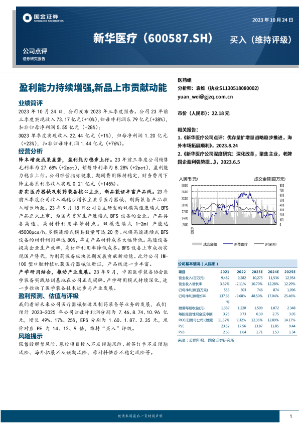 本报告对新华医疗2023年三季度业绩进行了分析,公司通过降本增效,盈利能力显著提升;医疗器械和制药装备两大核心业务收入稳定增长,新品上市丰富了产品线。维持“买入”评级,但同时也提示了相关风险。