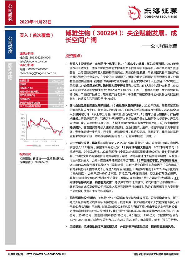 盈利预测与投资建议:血制品业务:公司现有浆站陆续建成开采,采浆量稳定增长,暂不考虑外延并购对公司血制品业务的影响。其他业务:复大经销业务和天安糖尿病业务分别于2023年9月和11月出表,剥离后公司2024年总收入有所下降,但由于经销业务毛利较低,对整体净利润影响较小。综合以上,我们预计公司2023-2025年实现营收27.66亿元、21.08亿元、23.87亿元,实现归母净利润5.38亿元、6.61亿元、7.81亿元,对应EPS分别为1.07/1.31/1.55元,对应PE分别为30.3倍/24.7倍/20.9倍。首次覆盖,给予“买入”评级。