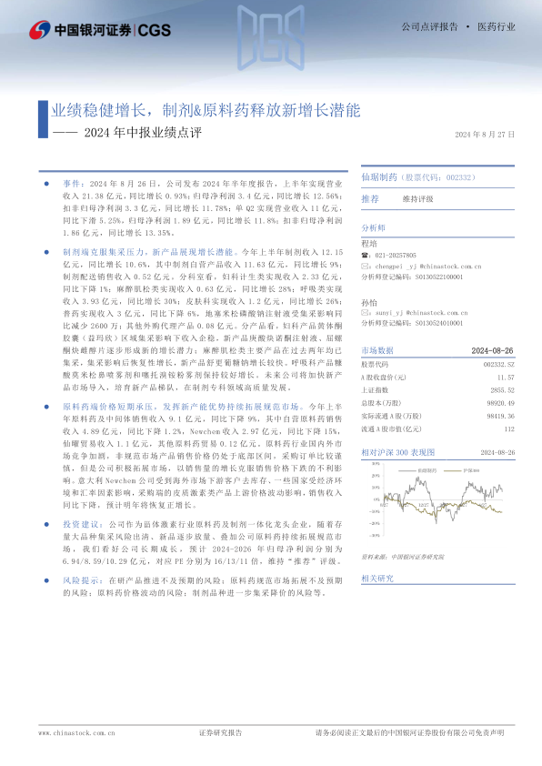 2024年中报业绩点评:业绩稳健增长,制剂&原料药释放新增长潜能