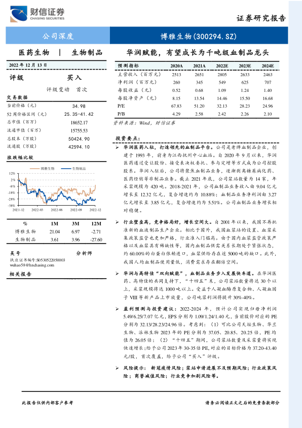盈利预测与投资建议:2022-2024年,预计公司实现归母净利润5.49/6.25/7.07亿元,EPS分别为1.09/1.24/1.40元,当前股价对应的PE分别为32.13/28.23/24.96倍。考虑到:(1)可比公司天坛生物、华兰生物、派林生物2023年的PE分别为37.05、20.85、20.25倍,PE均值为26.05倍;(2)“十四五”期间,公司浆站数量及采浆量将实现快速增长;给予公司2023年30-35倍PE,对应的目标价格为37.20-43.40元/股,首次覆盖,给予公司“买入”评级。
