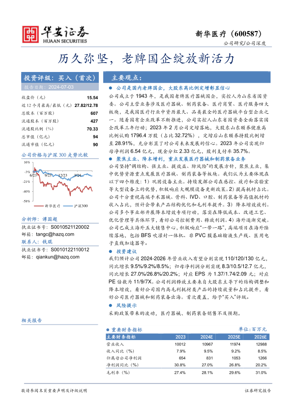 我们预计公司2024-2026年营业收入有望分别实现110/120/130亿元,同比增长9.5%/9.2%/8.5%;归母净利润分别实现8.3/10.5/12.7亿元,同比增长27.0%/26.8%/20.2%;对应EPS为1.37/1.74/2.09元;对应PE倍数为11/9/7X。公司利润释放主要来自大股东主导下的结构调整和降本增效,看好公司国内高毛利耗材类产品的持续放量和占比提升,看好公司医疗器械和制药装备出海。首次覆盖,给予“买入”评级。