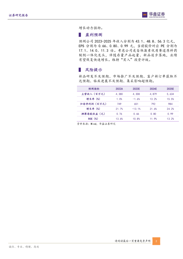 预测公司2023-2025年收入分别为43.1、48.8、56.3亿元,EPS分别为0.66、0.80、0.99元,当前股价对应PE分别为17.1、14.0、11.3倍。考虑公司是甾体激素优质赛道原料药制剂一体化龙头,伴随存量产品起量、新品逐步落地,业绩有望恢复快速增长。维持“买入”投资评级。
