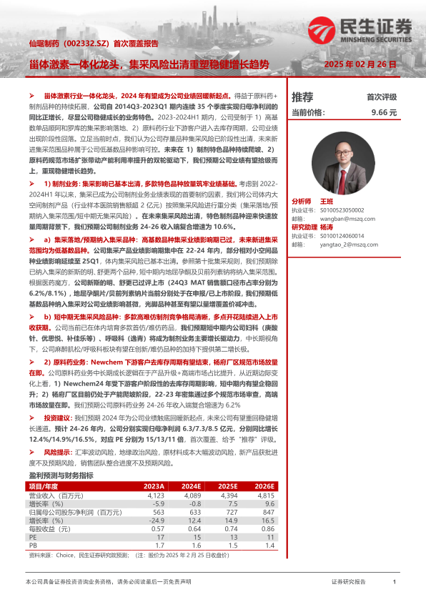 仙琚制药作为甾体激素一体化龙头,在经历2023年集采和原料药去库存的短期冲击后,已迎来业绩回暖的拐点。公司制剂业务的集采风险已基本出清,多款高难度仿制药和创新药(如复方庚酸炔诺酮注射液、屈螺酮炔雌醇片、戊酸雌二醇片、糠酸莫米松鼻喷剂、奥美克松钠)正进入快速放量期,有望成为未来业绩增长的核心驱动力。同时,原料药业务在杨府厂区通过多项国际认证后,产能利用率将逐步提升,高端规范市场份额有望持续扩大,与意大利子公司Newchem形成协同效应,共同打开成长天花板。报告预计公司2024-2026年归母净利润将实现12.4%、14.9%和16.5%的同比增长,当前估值具备较高投资性价比,首次覆盖并给予“推荐”评级。投资者需关注汇率波动、地缘政治、原材料成本、新产品获批及销售团队整合等潜在风险。