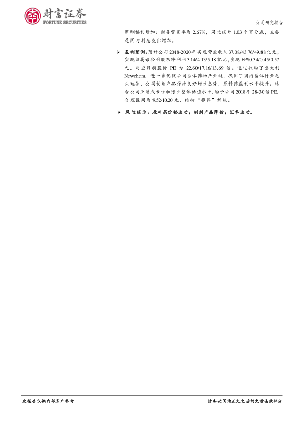 报告维持对仙琚制药的“推荐”评级,并给出了合理的估值区间。同时,报告也提示了投资者需要关注的风险因素,包括原料药价格波动、制剂产品降价以及汇率波动等。