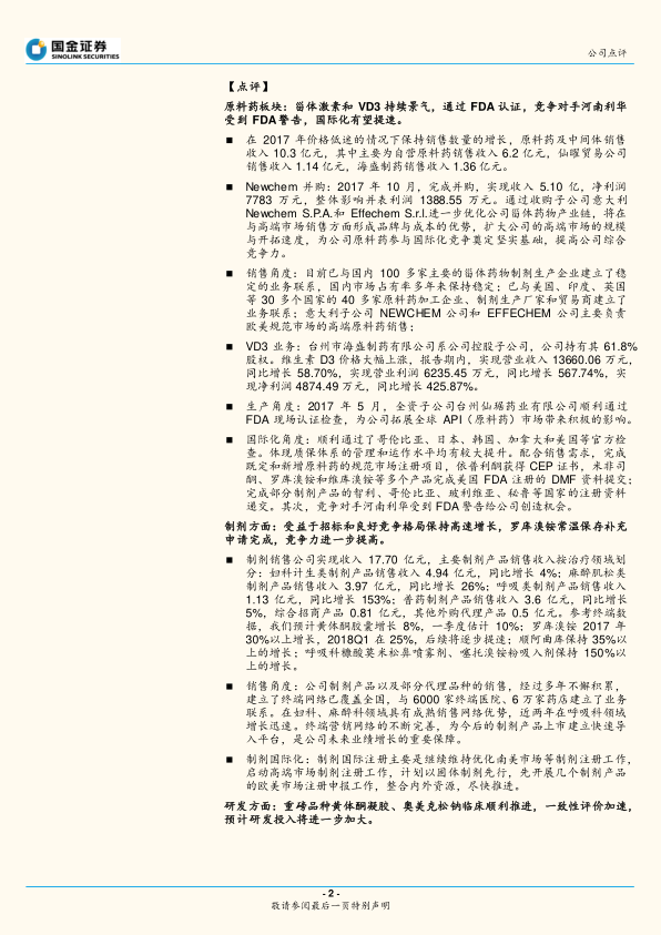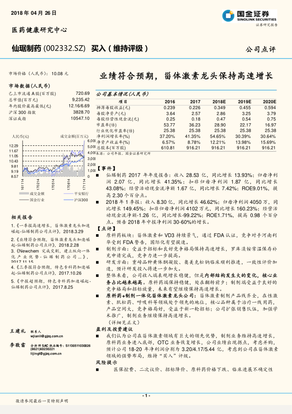 本报告分析了仙琚制药 2017 年的业绩和 2018 年一季度的表现,认为公司在甾体激素领域具有领先优势,制剂业务高速增长,原料药业务触底,OTC 业务恢复,业绩出现拐点。通过并购 Newchem,公司进一步优化了产业链,提升了高端市场竞争力。报告维持对公司的“买入”评级,但同时也提示了产品价格、原料药价格和临床进展等方面存在的风险。
