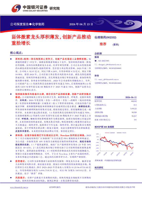 风险提示:在研产品推进不及预期的风险;原料药规范市场拓展不及预期的风险;原料药价格波动的风险;制剂品种进一步集采降价的风险。