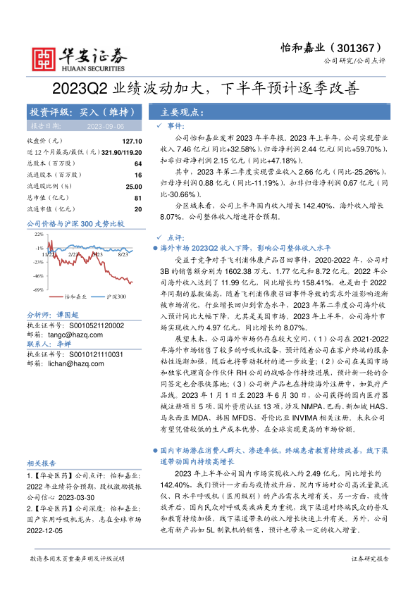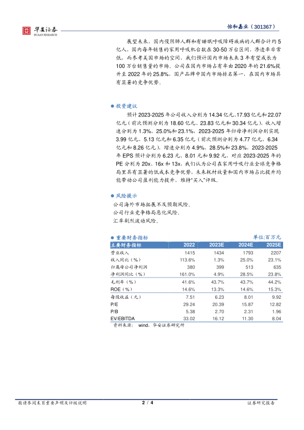 预计2023-2025年公司收入分别为14.34亿元、17.93亿元和22.07亿元(前次预测分别为18.60亿元、23.83亿元和30.34亿元),收入增速分别为1.3%、25.0%和23.1%,2023-2025年归母净利润分别实现3.99亿元、5.13亿元和6.35亿元(前次预测分别为4.77亿元、6.34亿元和8.26亿元),增速分别为4.9%、28.5%和23.8%,2023-2025年EPS预计分别为6.23元、8.01元和9.92元,对应2023-2025年的PE分别为20x、16x和13x,我们认为公司在家用呼吸行业全球竞争格局里具有显著的低成本竞争优势,未来耗材放量和国内市场占比提升均能带动公司盈利能力提升,维持“买入”评级。